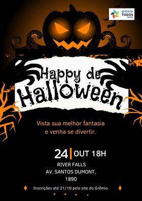 Inscrições válidas para sócios e mais 1 acompanhante;Consumação no local, não será permitido sair com bebida e comida;Haverá uma pessoa na recepção fazendo a conferência da lista de confirmados, entregando as pulseiras e os tickets;A pessoa que estiver na recepção irá avaliar se você está fantasiado e apto a receber o brinde;Cada pessoa inscrita receberá 1 ticket de Cheese Burguer, 1 ticket de água e 1 ticket de refrigerante;Teremos uma torneira de chopp pilsen, uma torneira de chopp APA e doses de Gin e Vodka liberadas para os sócios, mediante apresentação da pulseira no balcão para retirada;Cada pessoa poderá pegar apenas um copo de chopp por vez;O chopp estará livre apenas para as pessoas que estiverem com pulseira, caso o sócio ou seu acompanhante estejam dando copos de chopp para pessoas sem pulseira, será feito desconto de R$ 80,00 na folha do sócio responsável por copo doado;Os valores de acompanhantes serão descontados na folha de pagamento do sócio;Estacionamento gratuito no local;Inscrições e cancelamentos serão aceitos até o dia 21/10 às 18h;Convidados que não comparecerem ao evento, haverá desconto em folha como se tivessem comparecido;Sócios confirmados que não comparecerem ao evento, terão desconto em folha de R$ 80,00;Sócios cadastrados no Grêmio após 29/09/25, poderão participar do evento, no entanto com custo de R$ 80,00;O evento inicia às 18h e encerra às 00h;Caso deseje participar do concurso de melhor fantasia, procure algum participante da diretoria do Grêmio até 21h, para que seja anotado seus dados e seja feita a sua foto no local. Não serão aceitas fotos de candidatos que não tenham sido tiradas no painel de fotos montado no River Falls.
